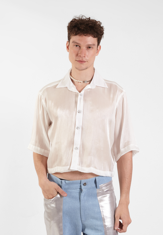 OCWA TIAGO OVERSIZED CROP SHORT SLEEVE SHIMMER WHITE SHIRT