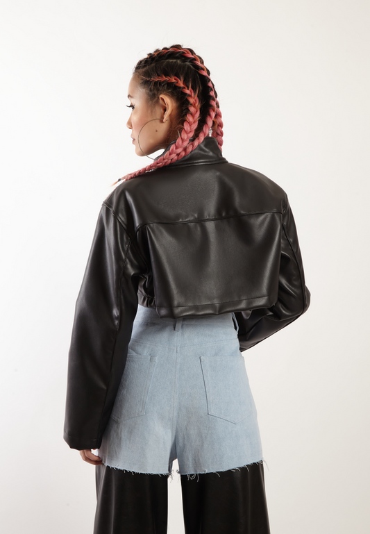 OCWA TROY PUFF SLEEVE CROP LEATHER JACKET BLACK