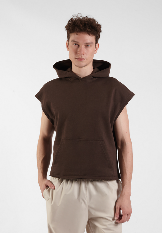 OCWA X VEDECI CONNOR BOXY CROP SLEEVELESS HOODIE DARK BROWN