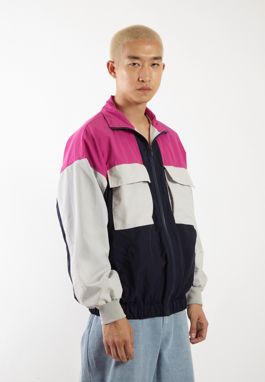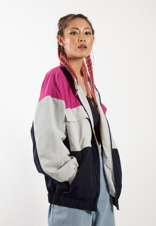 OCWA ELVIS COLORBLOCK 80S INSPIRED WATERPROOF JACKET PINK FUCHSIA GREY NAVY BLUE