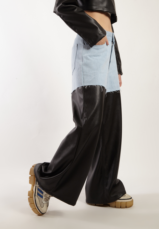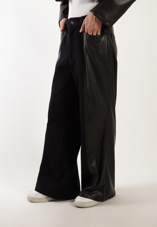 OCWA KYLE WIDE LEG BLACK DENIM MIXED BLACK LEATHER JEANS PANTS