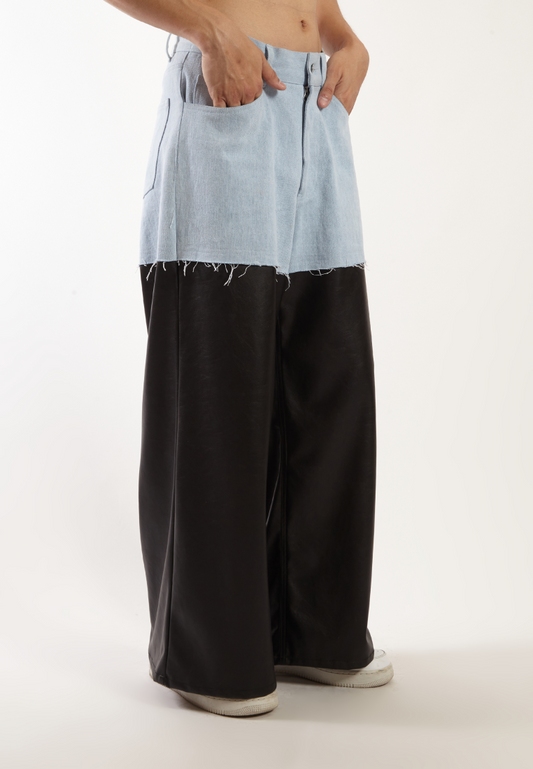 OCWA KYLE WIDE LEG LIGHT BLUE MIXED BLACK LEATHER JEANS PANTS